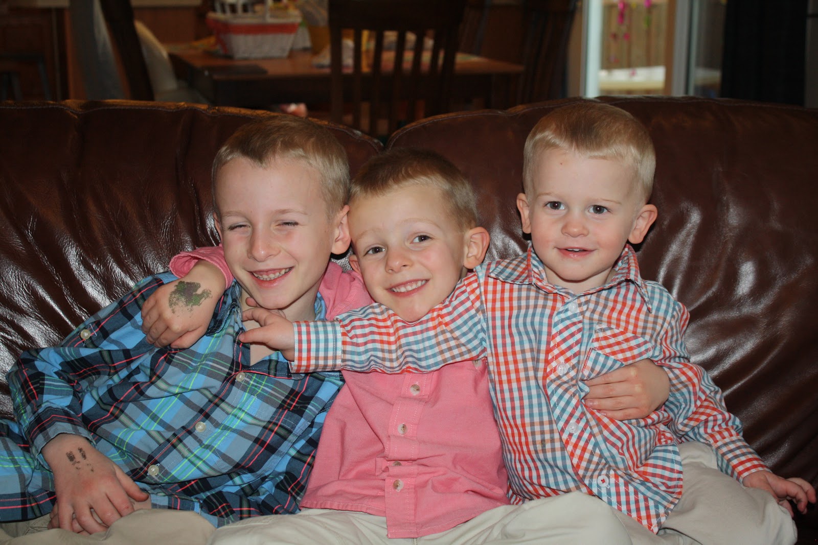 Then, Sunday morning. This year I was very cognizant of what I got for the Easter baskets. I wanted to keep it simple. Each kid got a book (Zach- Charlie and the Chocolate Factory by Roald Dahl, Drew- Marvel Superheroes, Jake- Star Wards 123), some M&Ms and jelly beans in plastic eggs, a strawberry cream heart, a Reeses Peanut Butter Cup bunny, a little flower-growing kit, a flashlight from the dollar bin at Target (because they are always fighting over our 2 flashlights), a torpedo for the pool this summer, a pack of gum (Zach and Drew only, of course, which is why Jake got 2 torpedoes- they come in a 4 pack anyway) and 2 gold dollars that I forgot to put in their stockings. About 2 weeks after Easter I realized I forgot to put the sunglasses I had purchased for each of them in their baskets, so I guess I'll continue the trend and save those for their stockings in December. Or, they'll get them some random time, when they have each lost the other pairs they got in their stockings a few months ago. Who am I kidding? The sunglasses they got at Christmas appear to be missing about 3 days a week, so they may get their glasses today.